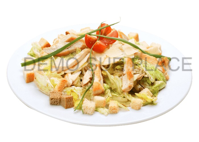 Salade, tomates séchées, poulet, croûtons, coupeaux parmesan.